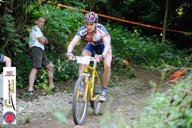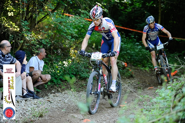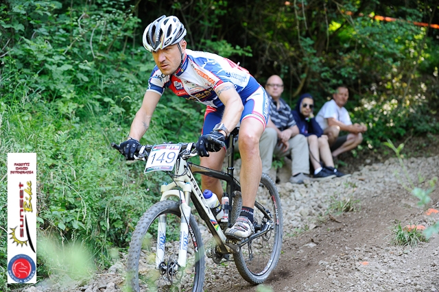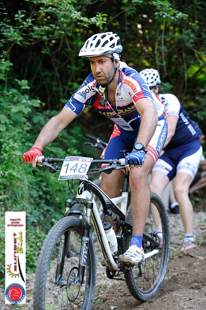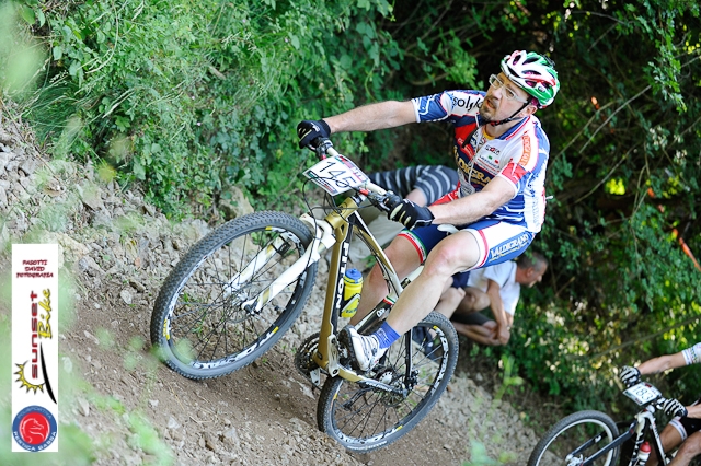 La salita lunga circa 20 minuti era alquanto impegnativa, sebbene le pendenze non fossero sempre elevatissime, ma anche dove l'erta sembrava meno impervia era la ghiaia e lo sterrato a renderla più faticosa. La discesa presentava alcuni passaggi spettacolari quali le due scalinate nel centro del paese di onodegno o la veloce mulattiera che in 5 minuti circa conduceva dal campo sportivo di onodegno al fondo del paese di Forno d'Ono. Mentre Bettelli in circa 24 minuti terminava il primo giro, il sottoscritto usciva dal paese di Ono Degno per puntare dritto verso il traguardo. Poco avvezzo ai sentieri, sembravo un ostacolo in mezzo al percorso , tanto che mentre le spalle e le dita delle mani mi si intorpidavano per la rigidita' e l'insicurezza con cui affrontavo la discesa, molti bikers mi chiedevano strada a destra e a sinistra perche' non facessi loro da tappo. A circa 500 mt dal traguardo il passaggio forse più tecnico della corsa con la mulattiera che d'un tratto lasciava spazio ad uno stretto sentiero che dopo solo pochi metri introduceva ad una secca curva a dx con due pietre ai lati che rendevano la tornata molto stretta e obbligava a prendere la mira per non centrare le pietre con la ruota anteriore. Nel primo passaggio a causa di un'indecisione il sottoscritto scivolava (vedi foto) proprio con l'anteriore che perdeva grip ed era causa di una caduta senza conseguenze che coinvolgeva anche un atleta del team cicli bacchetti (a proposito scusa!). La caduta costringeva pero' a scendere l'ultimo tratto della discesa a piedi in quanto troppo ripida per cercare di rimettersi in sella. Al termine del primo giro circa 14 minuti gia' mi separavano dai leader della corsa, e circa 1 minuto dai miei più vicini compagni di squadra con i quali era stata ingaggiata una sfida amichevole ed in palio c'era una bevuta alla salute dell'ultimo arrivato! Cadenelli Enrico e Zuaboni Luca che mi avevano passsato poco prima nel corso della discesa erano vicini, ma le gambe all'inizio del 2° giro erano gia' pesanti. Importante era cercare di tenere costante il ritmo e salvarsi da eventuale doppiaggio, pensando solo nell'ultimo giro alla possibilita' di non perdere la scommessa. Nel corso del 2° giro alcuni giovani ragazzi del team Manuel Bike dalla pedalata agile e veloce mi superavano dimostrandomi come la salita per qualcuno non fosse poi così dura (erano Costa e Pirlo del team Manuel Bike rispettivamente primo e secondo della corsa riservata ai giovani e partiti 10 minuti dopo di me!).
