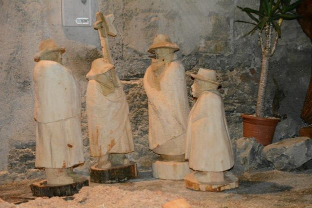 Nel suggestivo garage di Luciano, dal caratteristico soffitto in travi a vista di legno di castagno, quattro esponenti della Bottega di scultura di Pertica Bassa, diretti dal maestro Abele, si sono cimentati nella realizzazione di 4 sculture lignee raffiguranti i Cantori della Stella.