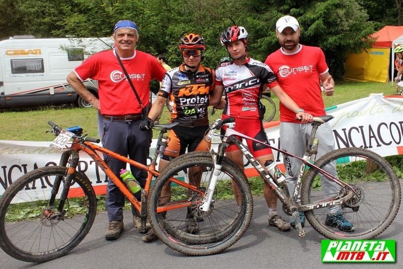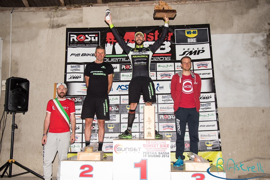 Pietro Sarai gestiva il vantaggio ed andava a chiudere trionfalmente, aggiudicandosi la Sunset Bike - 1ª Granfondo delle Pertiche, completando i 40km in 2 ore 2' 03'' mentre la seconda posizione se la conquistava il suo capitano Marzio Deho (+ 1'56'') che salendo verso le Furche ha prima preso Lombardi e poi lo ha nettamente staccato. Infatti il bresciano è poi arrivato terzo con un distacco di 4' 26''. Nello stesso punto il colombiano Malaver è riuscito a passare Laugesen.