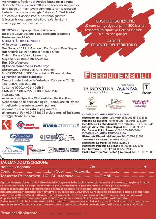 Ad Avenone, Frazione di Pertica Bassa, nella serata di Sabato 24 Febbraio 2018, in uno scenario suggestivo, avrà luogo un'incantevole camminata con racchette da neve ('ciaspole' - nelle ultime edizioni bastava una scarpa da montagna), con tappe presso le malghe 'Maruzzo' (Pertica Bassa) e 'Valsorda' (Pertica Alta) e 'Cascina Pof' in cui ci si potrà tuffare in assaggi gastronomici a base di leccornie tipiche del Territorio di Pertica Bassa e Alta oltre a bevande calde ed altre sorprese.