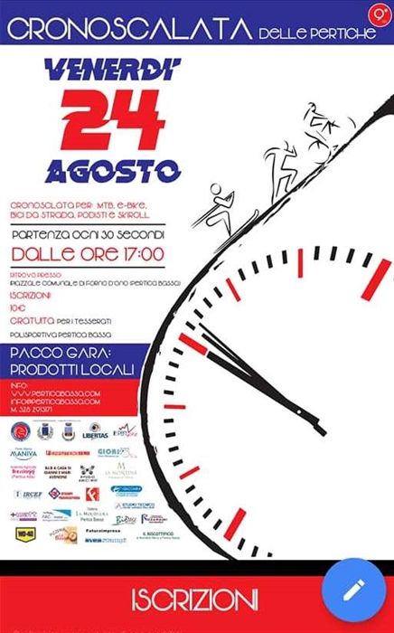 Venerdì 24 agosto 2018, ripetiamo per il nono anno consecutivo la Cronoscalata delle Pertiche con partenza dalla Frazione Forno d'Ono di Pertica Bassa (nella stessa frazione presso l'Osteria La Meridiana verranno effettuate anche le premiazioni) ed arrivo nella Frazione Livemmo di Pertica Alta (qui previsto il ristoro).