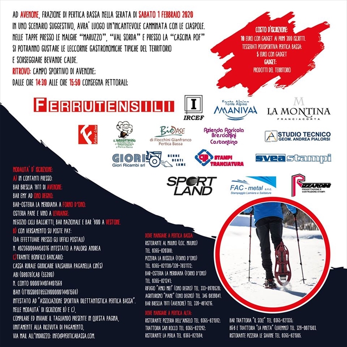 Ad Avenone, Frazione di Pertica Bassa, nella serata di Sabato 1 Febbraio 2020, in uno scenario suggestivo, avrà luogo un'incantevole camminata con racchette da neve ('ciaspole' - nelle ultime edizioni bastava una scarpa da montagna), con tappe presso le malghe 'Maruzzo' (Pertica Bassa) e 'Valsorda' (Pertica Alta) e 'Cascina Pof' in cui ci si potrà tuffare in assaggi gastronomici a base di leccornie tipiche del Territorio di Pertica Bassa e Alta oltre a bevande calde ed altre sorprese.