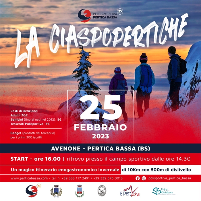 Ad Avenone, Frazione di Pertica Bassa, nella serata di Sabato 25 Febbraio 202., in uno scenario suggestivo, avrà luogo un'incantevole camminata con racchette da neve ('ciaspole' - nelle ultime edizioni bastava una scarpa da montagna), con tappe presso le malghe 'Maruzzo' (Pertica Bassa) e 'Valsorda' (Pertica Alta) e 'Cascina Pof' in cui ci si potrà tuffare in assaggi gastronomici a base di leccornie tipiche del Territorio di Pertica Bassa e Alta oltre a bevande calde ed altre sorprese.