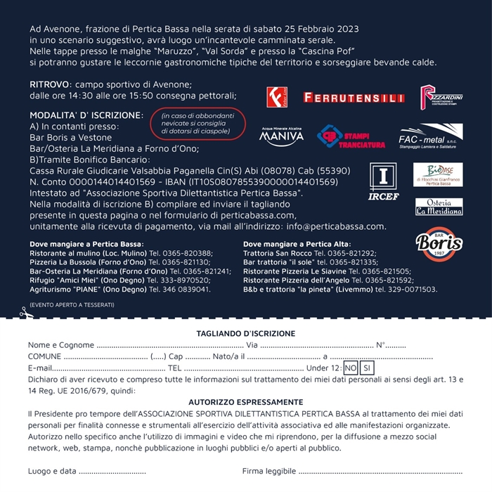 Partenza ore 16.00 da Avenone di Pertica Bassa e per la prima volta dal suggestivo Borgo Medioevale di Spessio, sempre nella frazione di Avenone dove troverete oltre alla segreteria dell'evento anche gli stand dei produttori locali e gli Alpini di Pertica Bassa ad attendervi all'arrivo con bevande calde.