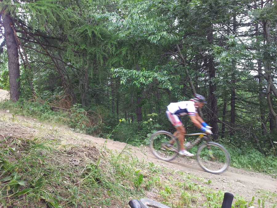 In griglia al mio fianco mi ritrovo un peperino di ragazza in preda alla nostalgia della sua ultima gara in mtb, avvenuta almeno 13 anni prima e con l'assillo di essere inadeguata per quel tipo di gara; gomme gonfiate a 3,5 atmosfere, niente spolverino (supereremo più volte i 2400 metri di altitudine) ne fast o camere d'aria!!