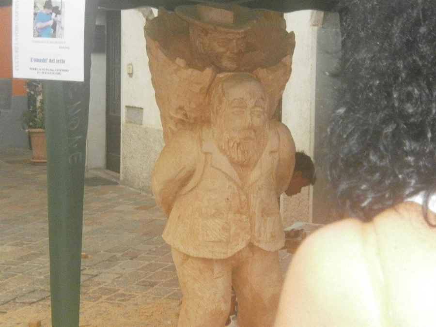Zambelli Gianluigi, docente della Bottega, con Giancarlo Castelnuovo e Facchini Pierino da Belprato hanno magistralmente interpretato tre figure del carnevale livemmese. Era emozionante sabato sera vedere volteggiare le vere maschere locali in mezzo alle sculture che le rappresentavano!