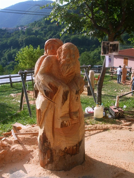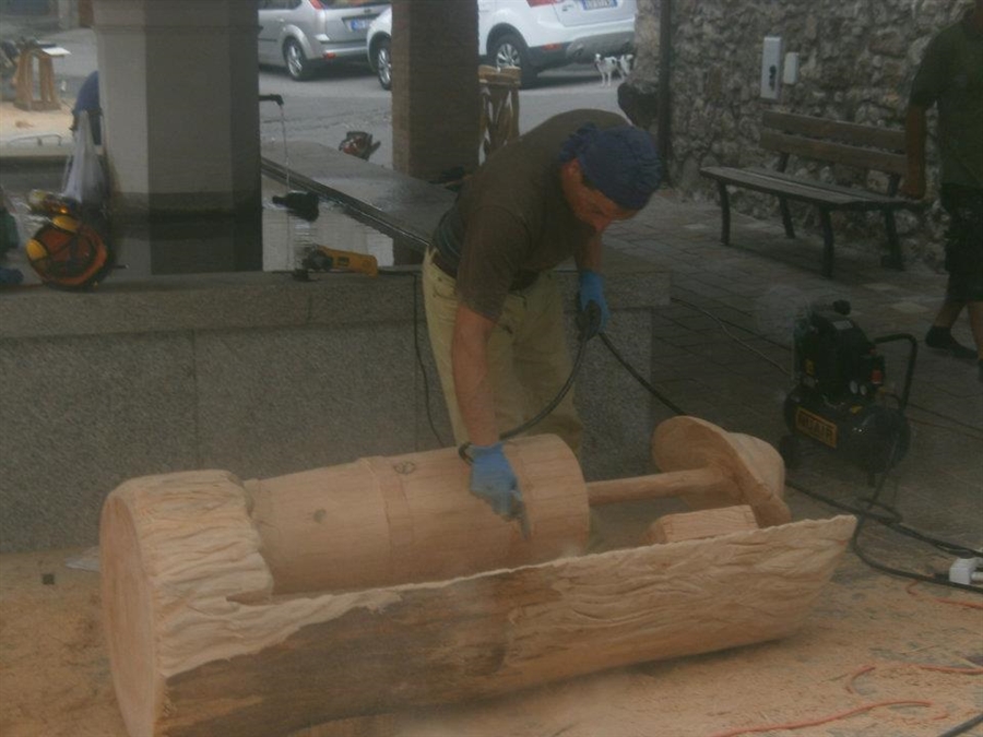 Per discrezione abbiamo sgrossato le sculture nelle vicinanze del campo sportivo per evitare agli abitanti l'eccessivo rumore delle motoseghe e l'inevitabile trambusto, ma è stato dal momento che ci siamo trasferiti nel cuore della piazza che ha avuto inizio il vero spirito dei nostri simposi.