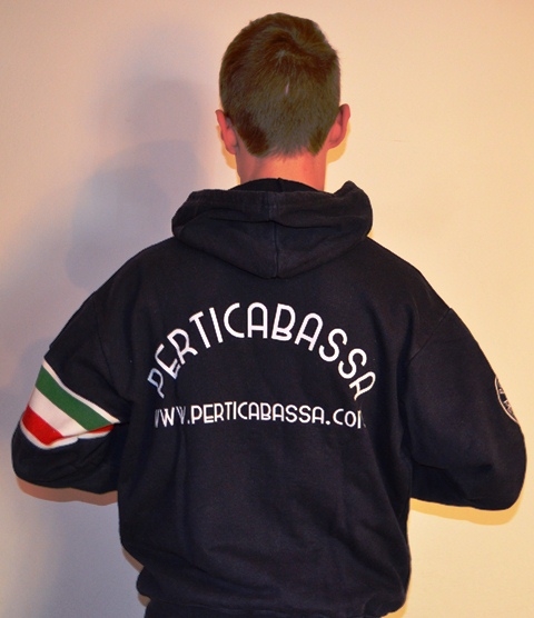 Sulla manica destra primeggia ricamato, il logo della Polisportiva Pertica Bassa, davanti il drago Polisportiva e sul retro la scritta Polisportiva Pertica Bassa ed il sito internet.